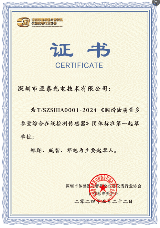 在《深圳市培育發展智能傳感器產業集群行動計劃(2022-2025年)》的指導下,傳感器企業越來越成為深圳國民經濟和社會發展的新質生產力,但與此同時,在潤滑油在線檢測傳感器領域并沒有具有針對性的指導標準。亞泰光電牽頭起草全國首個油液監測傳感器器團體標準(T/SZSIIIA0001-2024),已實施并出版(由中國標準出版社出版發行,各地新華書店經銷)。這是對深圳市亞泰光電技術有限公司和相關潤滑油狀態監測傳感器企業提出了更高的要求。它將推動傳感器技術的創新、促進潤滑油行業的數字化轉型、加強行業間的合作與交流,并提升我國在全球潤滑油市場的地位。隨著標準的深入實施和應用,相信我國潤滑油行業將迎來更加廣闊的發展前景。